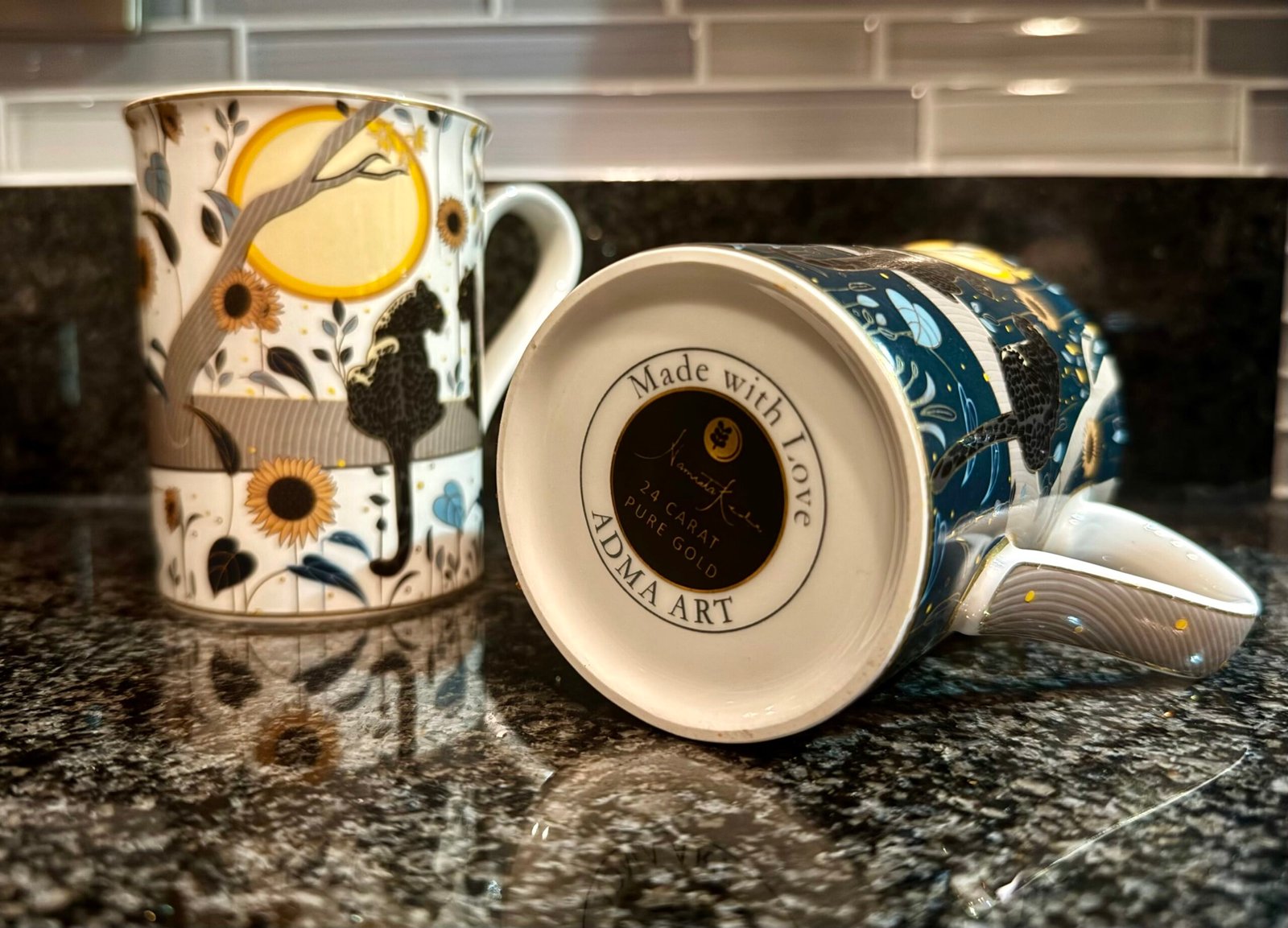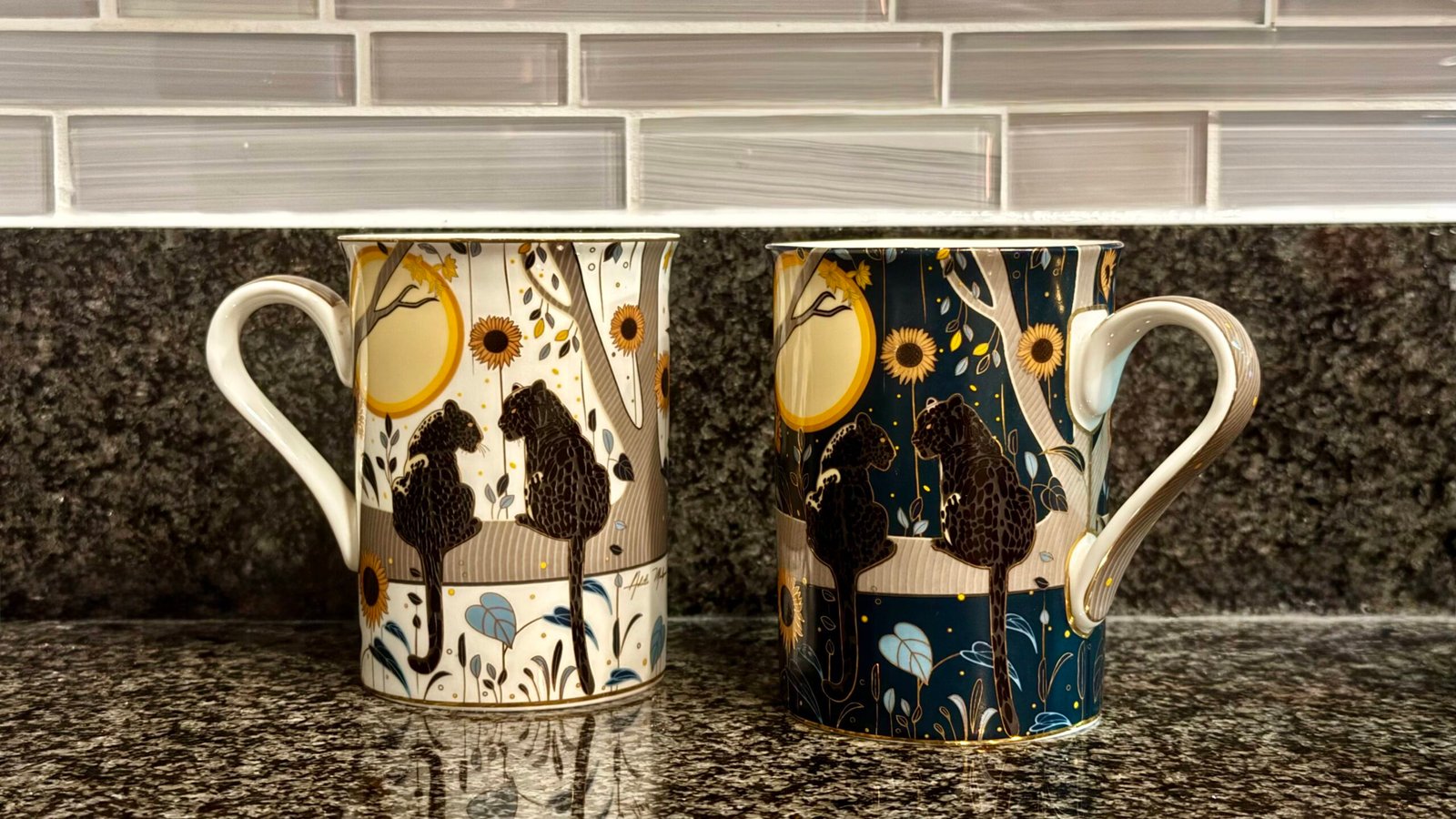 These His and Her special edition coffee mugs are part of my Earth element collection. They are inspired by my oil painting of two leopards in a sunflower field and translated into functional art.